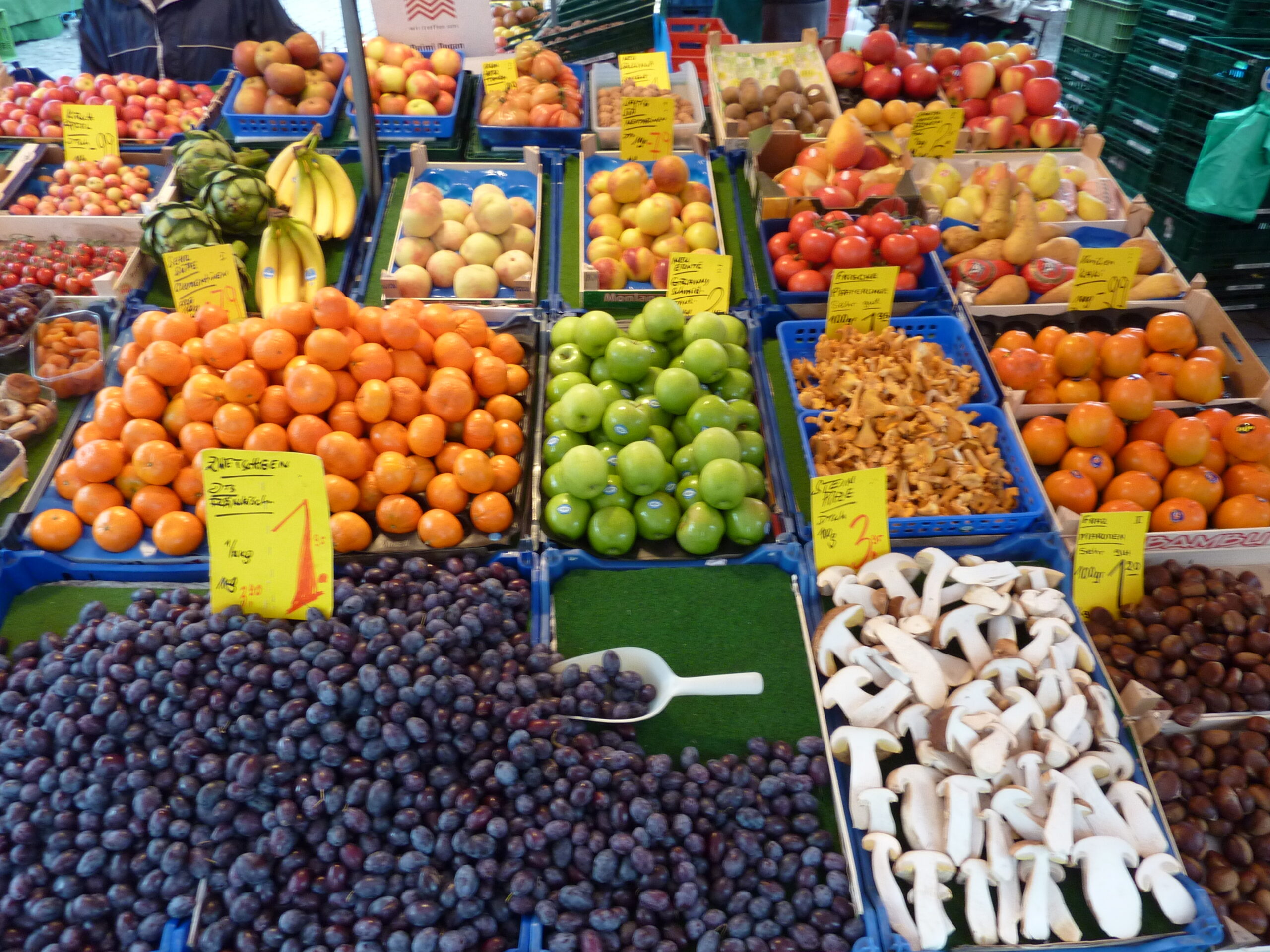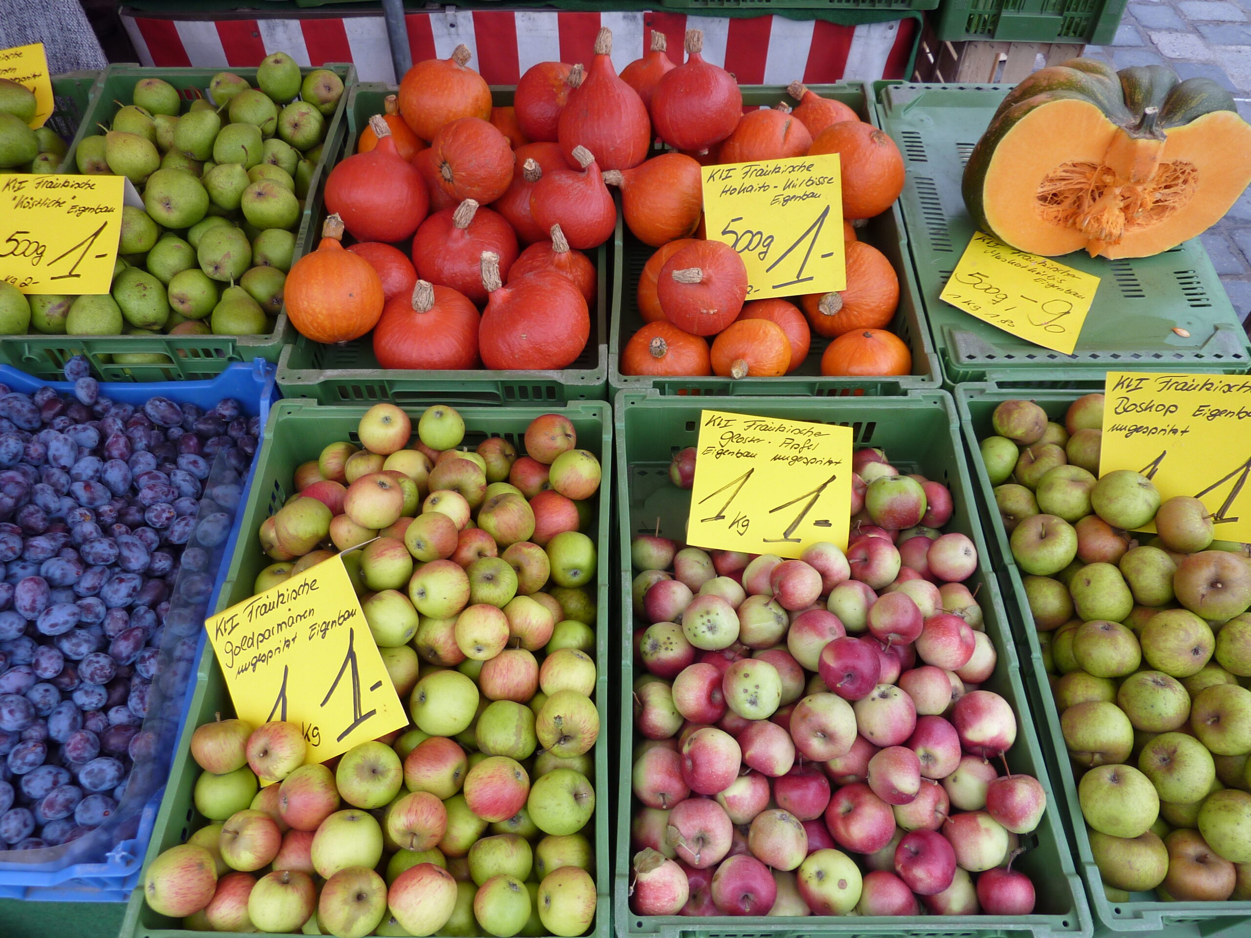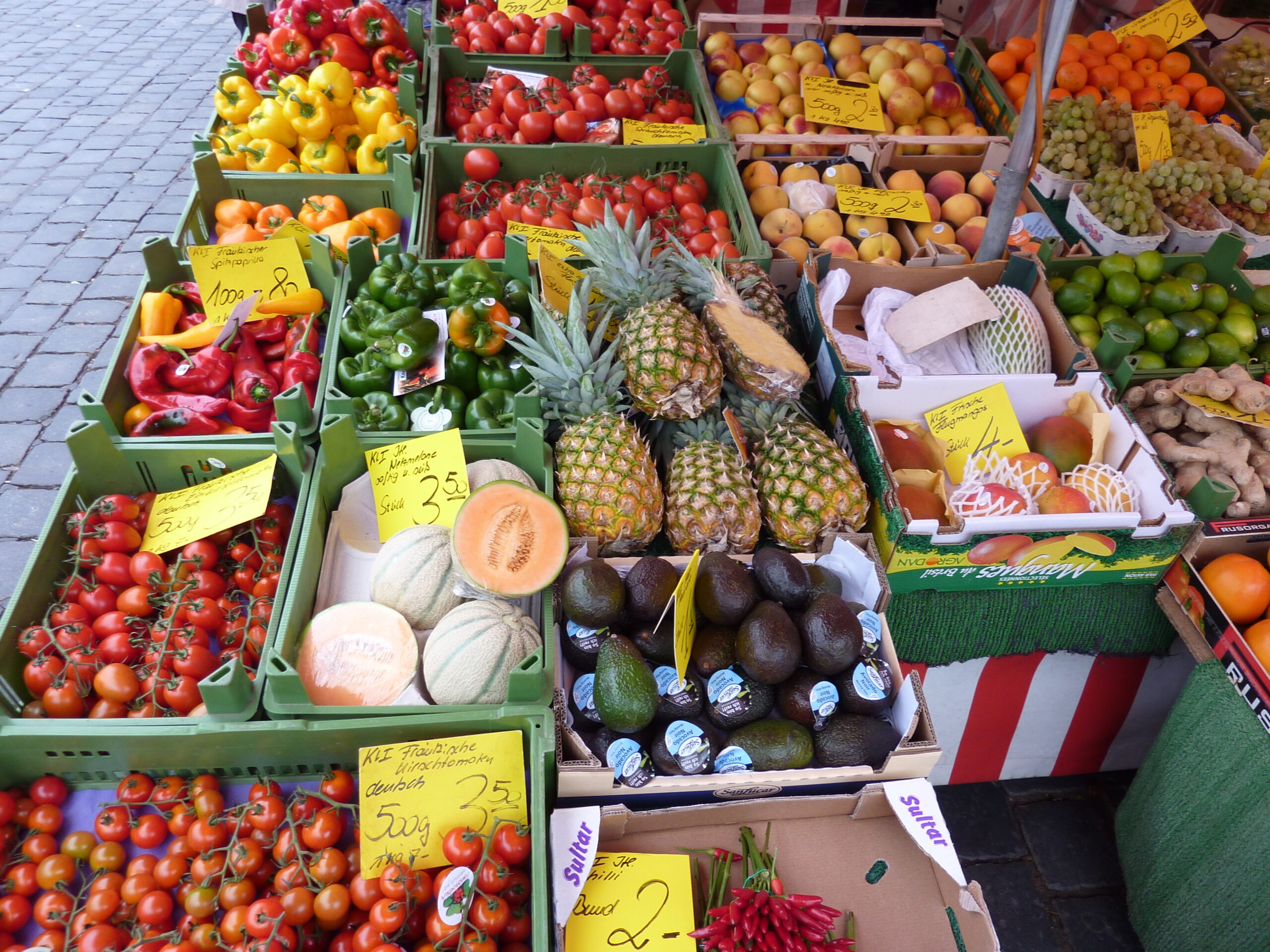 ニュルンベルグの朝,マーケットでは新鮮なフルーツや野菜が売られている。